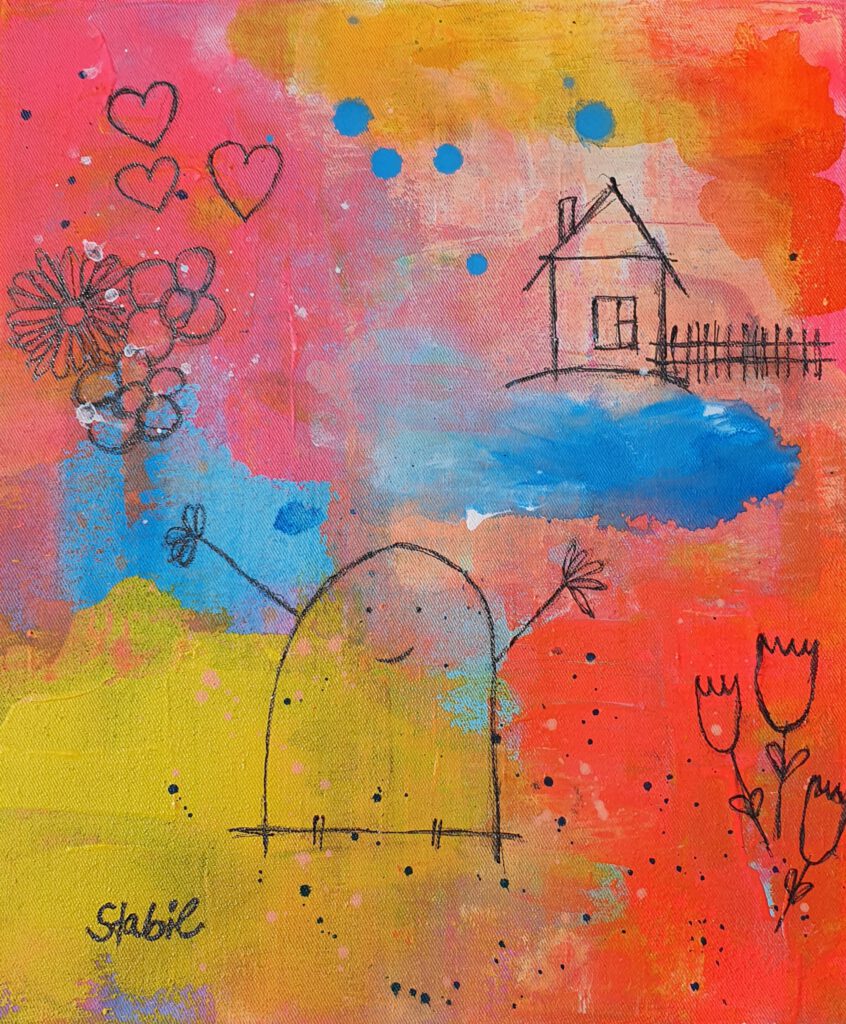 In intensiven Farbschichten, aufgetragen mit Spachteltechnik, entfaltet sich eine verspielte Szenerie aus Herzchen, Blumen, einem kleinen Haus und einer fröhlichen Figur, die die Arme in den Himmel streckt.