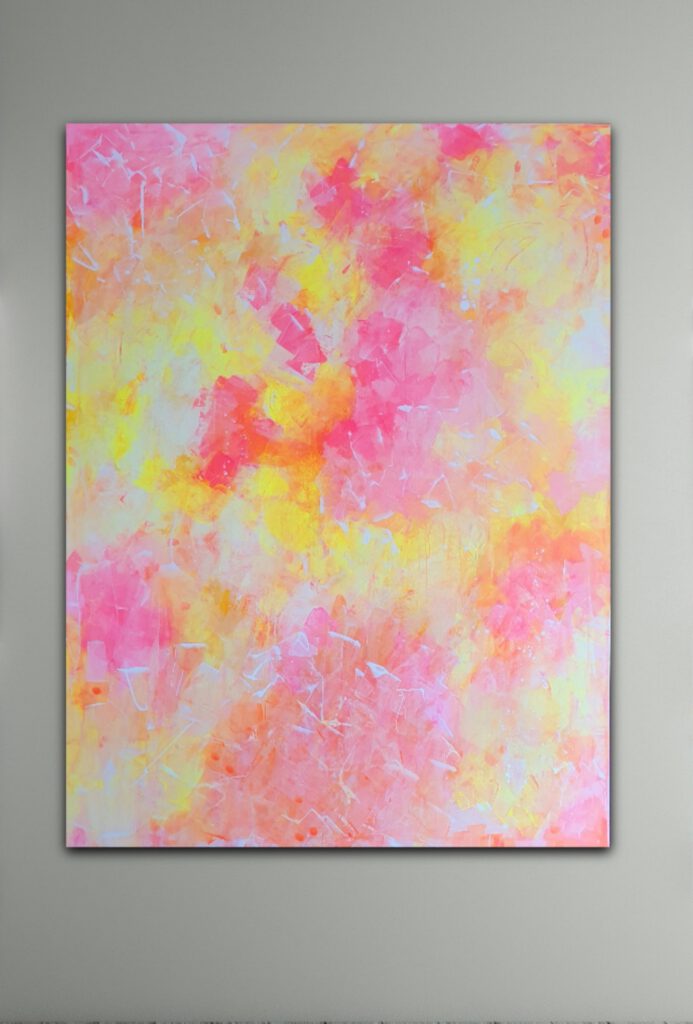 Dieses Werk ist deine wuchtige, visuelle Kampfansage an das ewige Anpassen. Wo die Welt im Außen von dir erwartet, bequem und unauffällig zu funktionieren, setzt dieses Bild einen massiven Gegenpol. Die energiegeladenen Farbexplosionen in Pink und Orange, kompromisslos durchbrochen von dem leuchtenden Gelb im Zentrum, sind dein täglicher Anker. Wenn du vor dieser Leinwand stehst, spürst du den sichtbaren Startschuss: Du bist nicht hier, um es anderen recht zu machen. Du nimmst dir deinen Raum – in voller Lautstärke und ohne jeden Kompromiss.